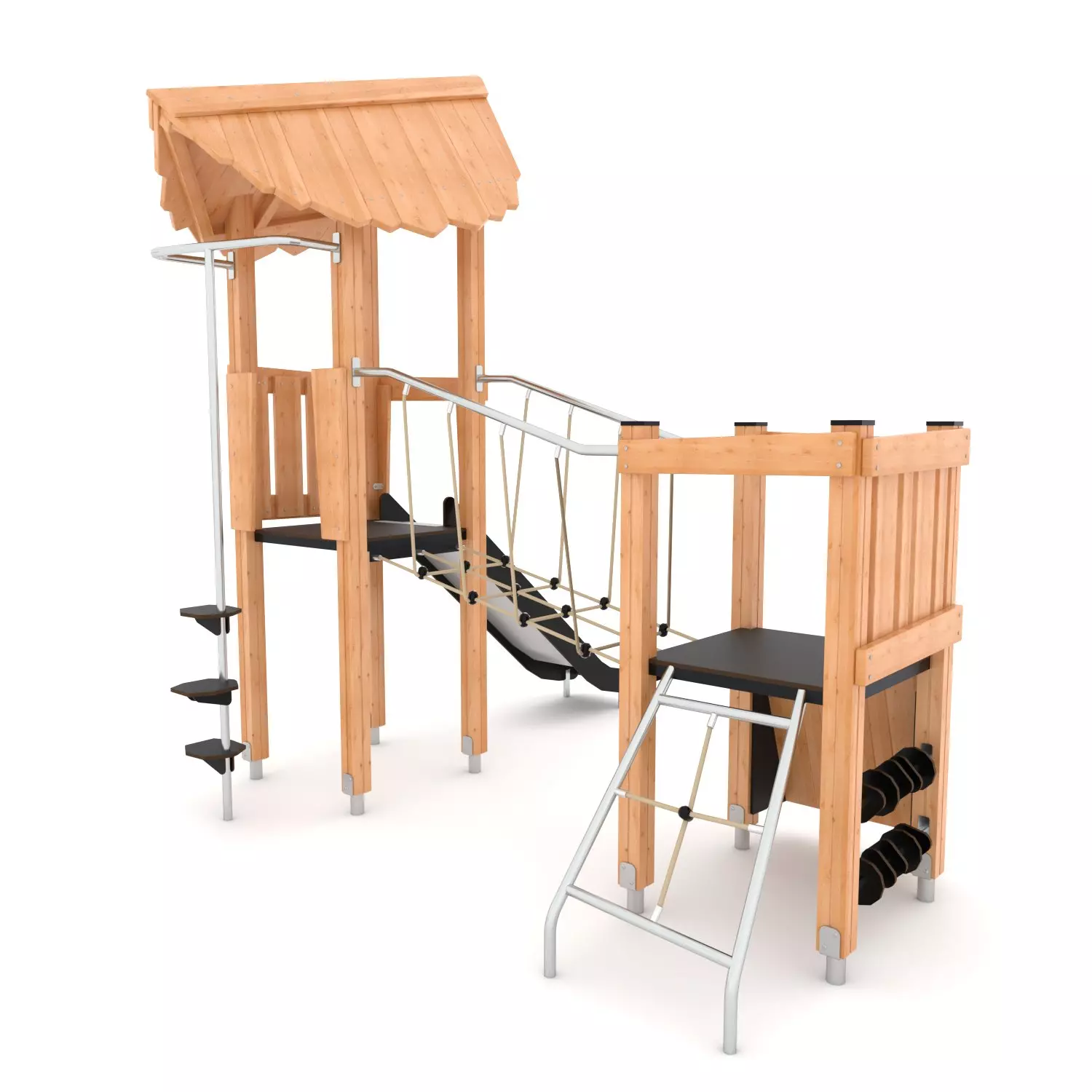 La tour de jeux double Naturo est entièrement fabriquée en bois de pin laminé et imprégné durable. Les plateformes sont constituées de panneaux HPL résistants et ont une structure en acier. La combinaison de tours de jeux se compose de deux tours de jeux, dont une avec un toit de forme unique. La combinaison comprend également une échelle d’escalade, un mur d’escalade, un pont suspendu, des marches d’escalade et un toboggan.