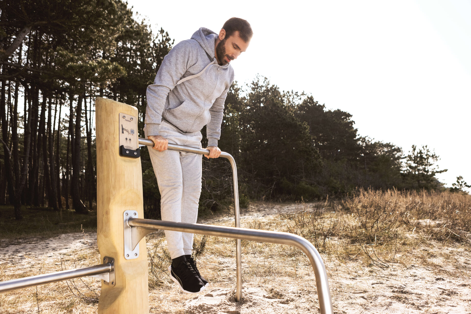 Les poignées et les rampes des équipements de fitness en robinier sont en acier inoxydable.
